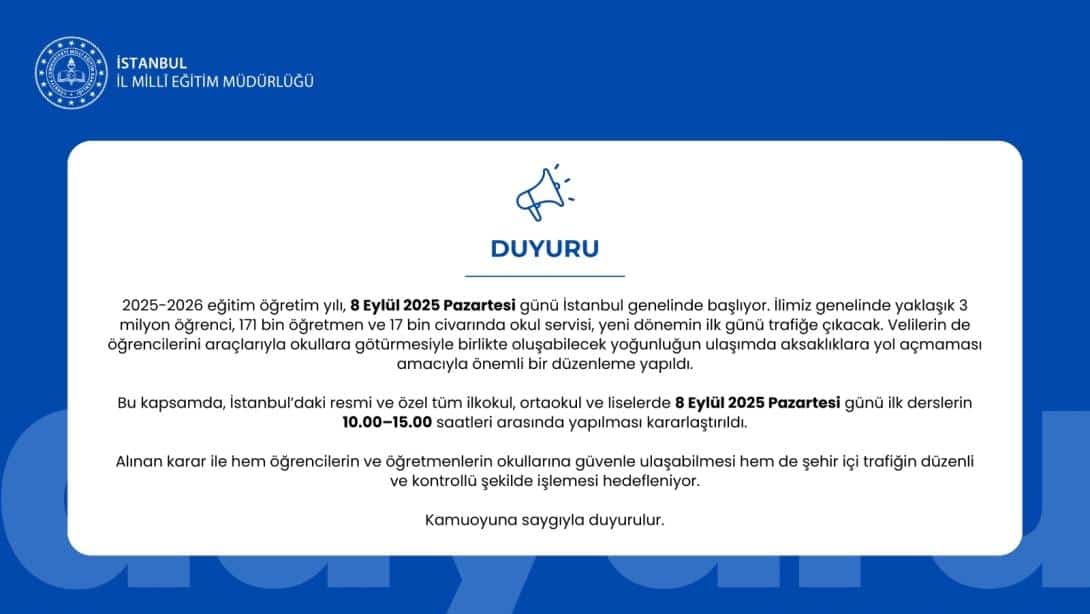 İstanbul İl Milli Eğitim Müdürlüğü'nün resmi duyurusuna göremeb_iys_dosyalar/34/26/727564/dosyalar/2025_09/05150530_istanbulmemduyuru.jpg 2025-2026 Eğitim öğretim yılı 8 eylül pazartesi günü tüm sınıflarda saat 10.00 da başlayacaktır.Velilerimize duyurulur.